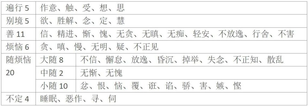 一遍行五者,一作意二触三受四想五思。二别境五者,一欲二胜解三念四定五慧。三善十一者,一信二精进三惭四愧五无贪六无嗔七无痴八轻安九不放逸十行舍十一不害。四烦恼六者,一贪二嗔三慢四无明五疑六不正见。五随烦恼二十者,一忿二恨三恼四覆五诳六谄七骄八害九嫉十悭十一无惭十二无愧十三不信十四懈怠十五放逸十六惛沈十七掉举十八失念十九不正知二十散乱。六不定四者,一睡眠二恶作三寻四伺。”[44]