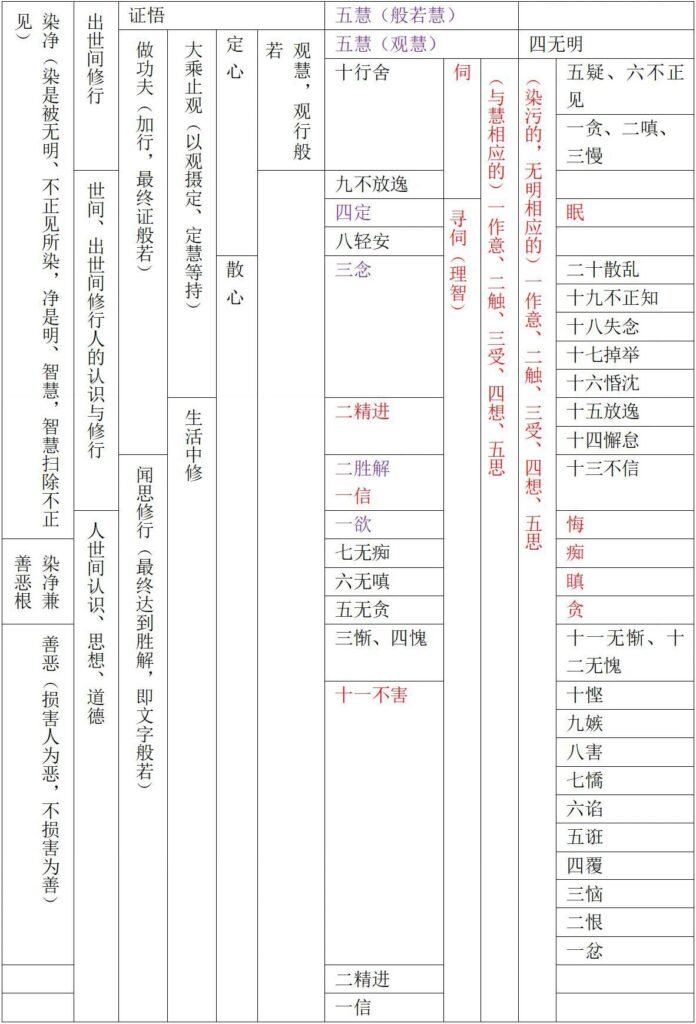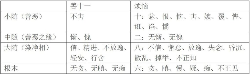 - 此表从“善”与“烦恼”相对照的角度,展示了心所法的另一个分类维度。
