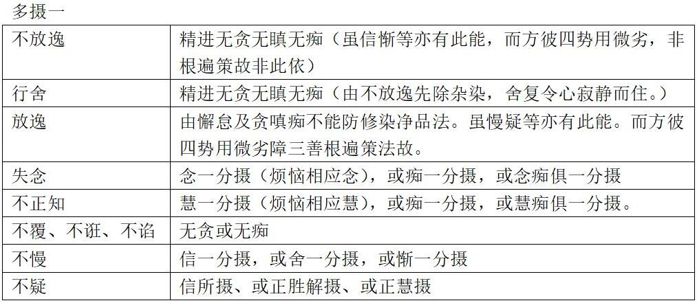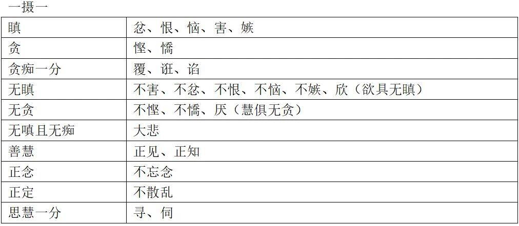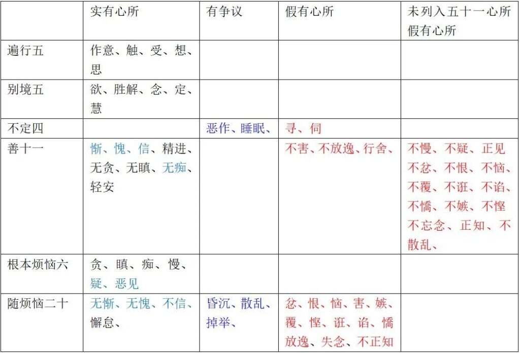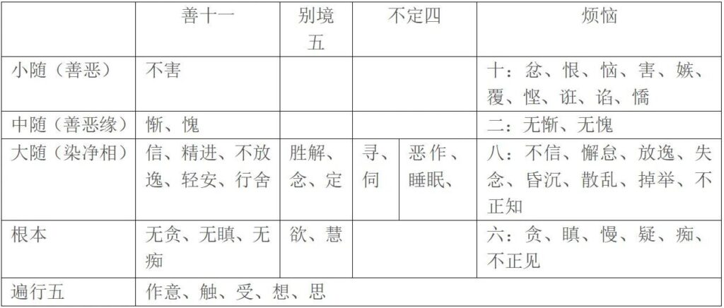 - 原图表“不定四”栏下的“恶作、睡眠”在大随一行中没有对应的善/别境法,为保持表格平衡而放置,其在“不定”分类中的性质不变。