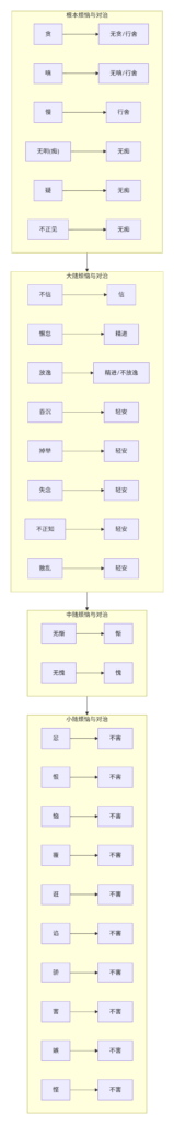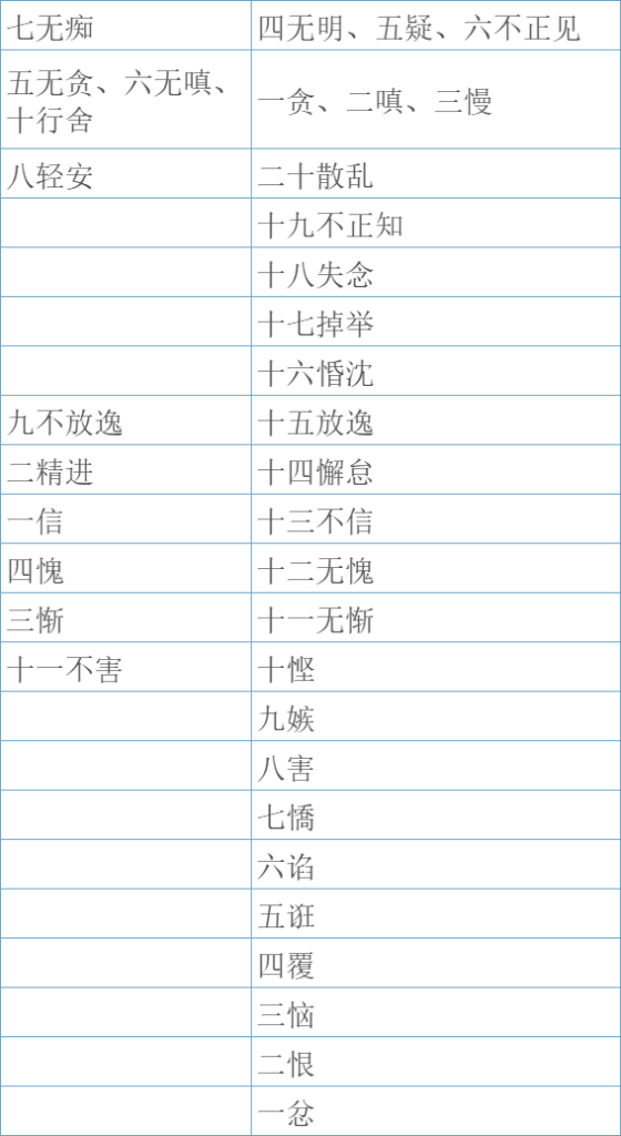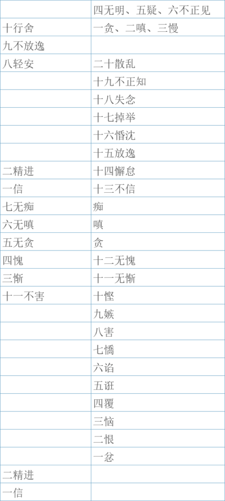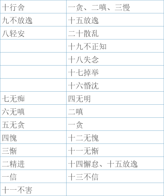 此表以善法(净)对治烦恼法(染)的视角,展示了心所之间的对应关系。