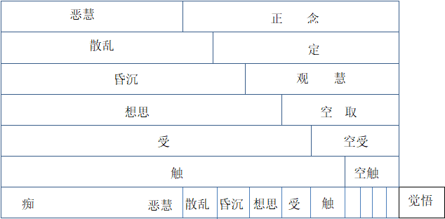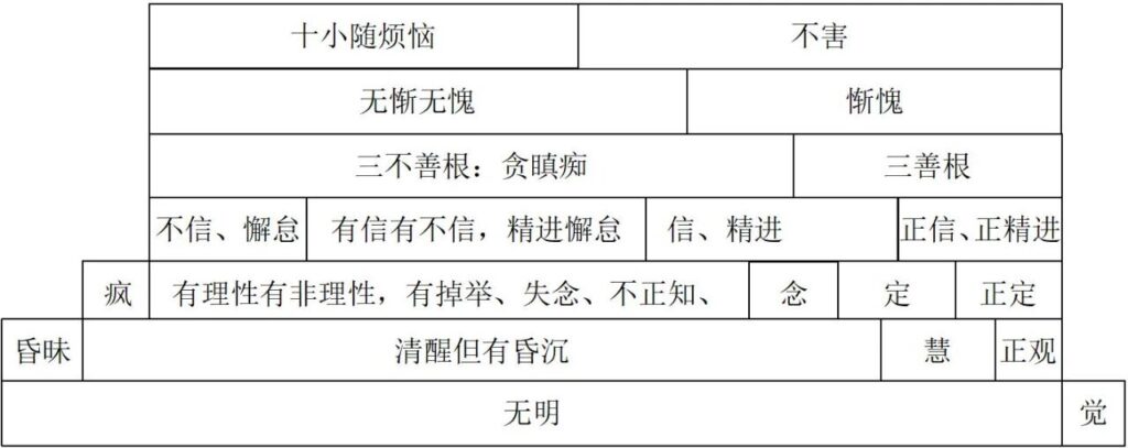 2)此图简化为四层,因为信、无贪、惭愧、不害等等都属于想思的范畴,可以摄入恶慧善慧一层。只留下无明、昏沉、散乱、恶慧四层。