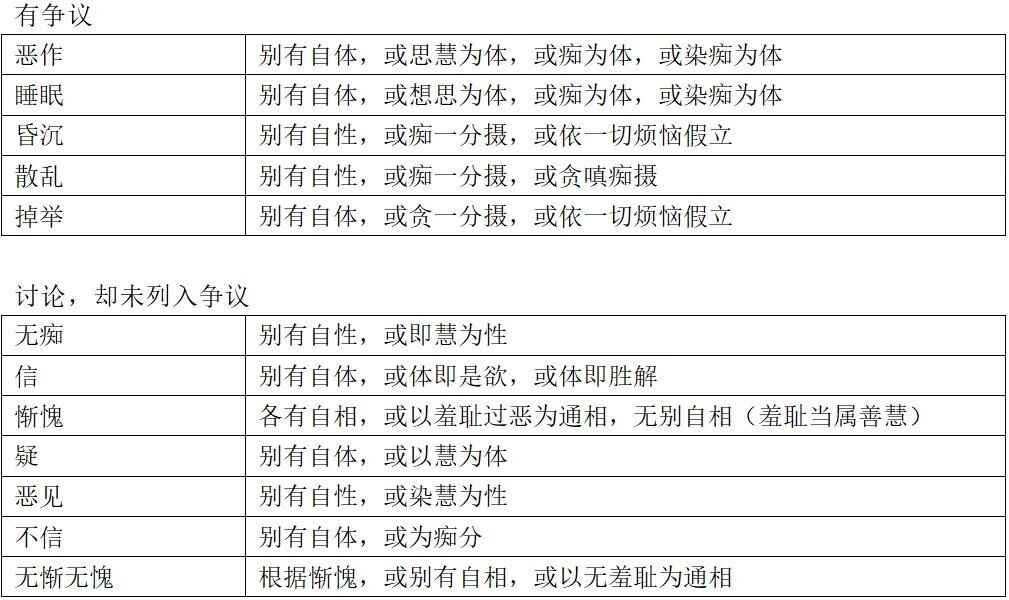 这些有争议的从属关系,即使不是假有,也说明这些心所之间存在联系或衍生关系。从探索心所之间关系的角度值得重视。