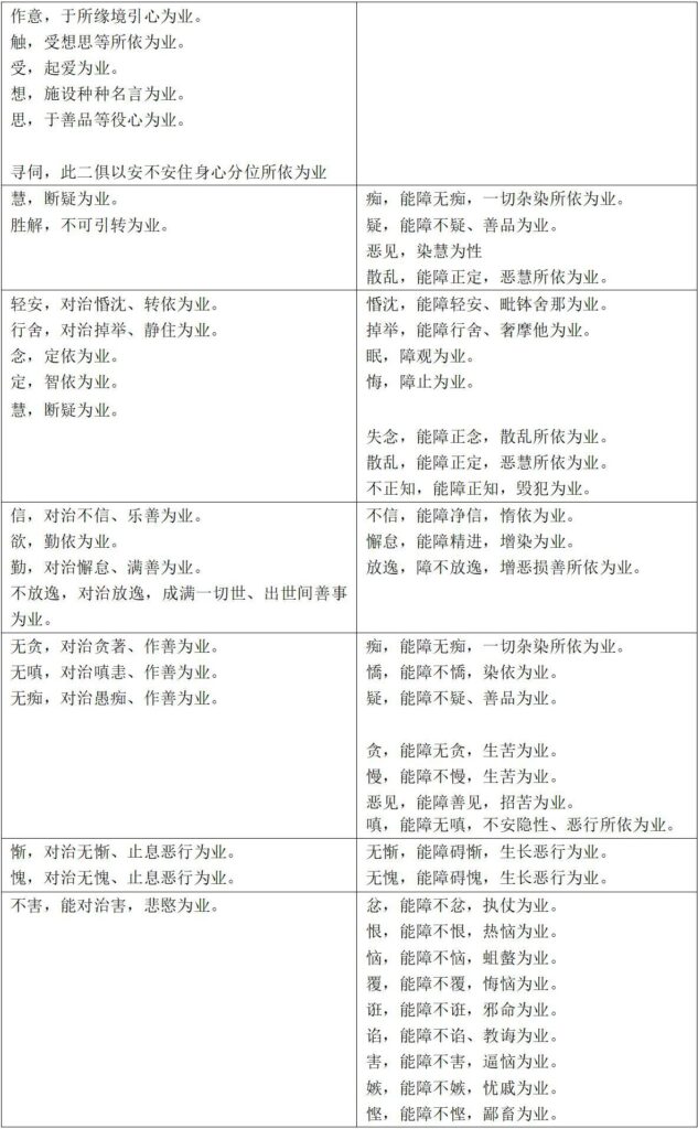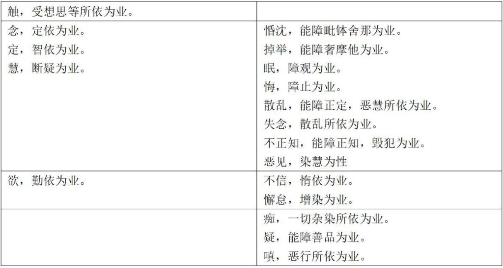 上表是全部心所业用。烦恼心所和善心所都有成对的关系,烦恼心所“障……”,善心所“对治……”。另外一些心所之间有所依关系,典型的如“智依定、定依念”。这类情况有以下几个。