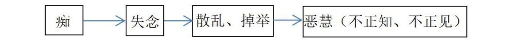 第一系,失念、散乱、掉举、不正见不正知,这一组不是包含关系,而是引生关系。失念是散乱所依,掉举散乱和不正知有因果关系。昏沉(及眠)与之关系密切,但没有直接的所依或引生关系。这些都和痴有直接关系,甚至有人认为它们是不同形式的痴。
