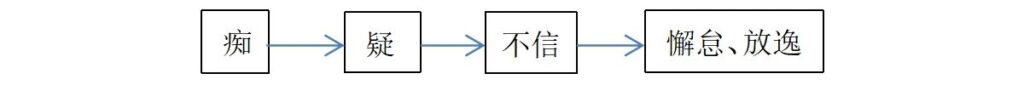 14)不信和疑之间显然有关,疑是犹豫,程度较弱,不信程度较强。这样,痴→疑→不信→懈怠,可以成一系。