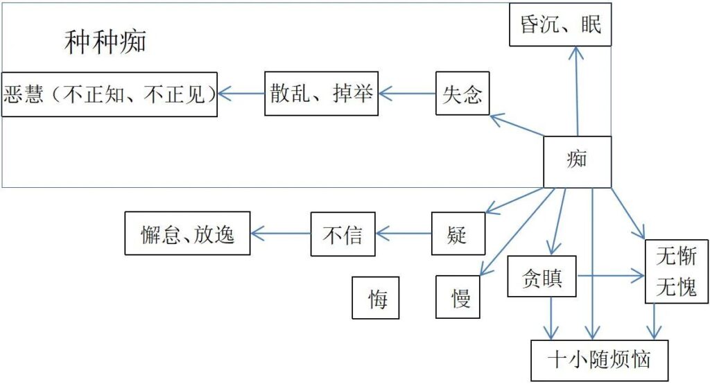 7)痴→失念→散乱→恶见、不正知。上述讨论把这几个心所连成了一个体系。这几个心所都是痴或痴与其他心所结合,总的来说是各种形式的痴生起的关系。