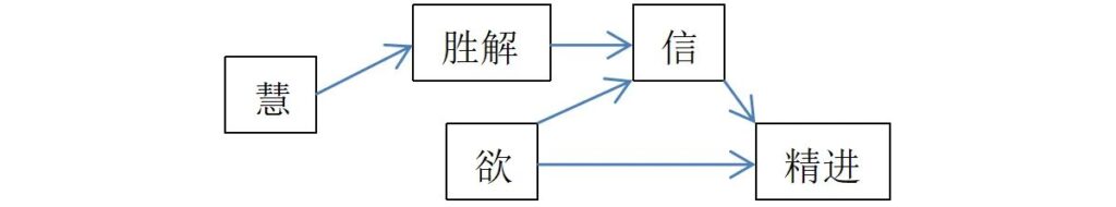 3)欲,勤依为业,即欲→精进。另外,不信→懈怠,反过来精进必须以信为前提。所以,信、欲→精进。