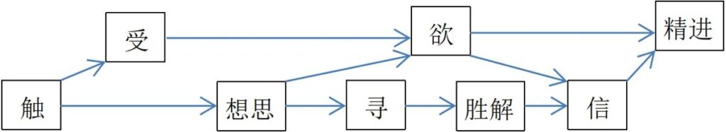 4)要生定必须有精进。补上这条线就可以把以上心所都连成一体了。触→想思→寻伺(寻思慧)→胜解、欲→信、精进→念→定→慧。