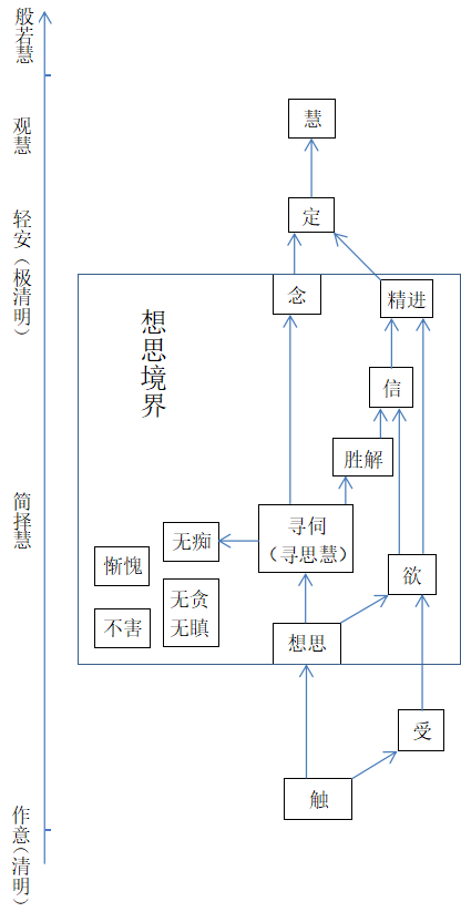 7)清明慧→寻思简择慧→观慧,这是慧的不同形式和次第。五遍行的前提清明,作意是清明慧的开始,轻安是清明达到一定程度。胜解念定等要以简择慧为基础,最后生起观慧。所以,整个体系可以理解为从较低的慧提升到较高的慧的过程。