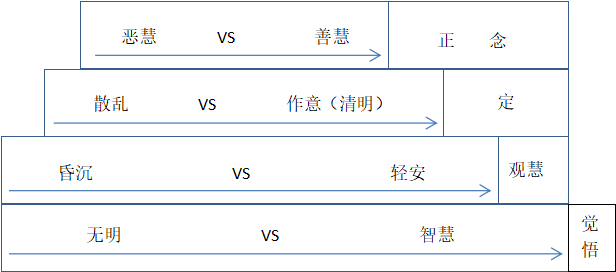 5)剩下中还有作意、轻安两心所。轻安与昏沉相对,作意“能警策其心”,也与昏沉相对。所以,它们都是痴的对立面。但比寻思中的慧低一级,只是保持清明而已。保持清明是昏沉的反面,属于最基本的慧,可称为清明慧。