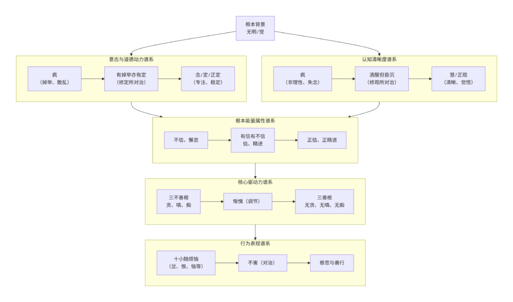 第三系,贪嗔痴三不善根,及无惭无愧和十小随烦恼,小随烦恼明确属于贪瞋痴一部分,贪嗔痴和无惭无愧也有因果关系。贪瞋痴也以恶慧为基础,可以接上第一系。