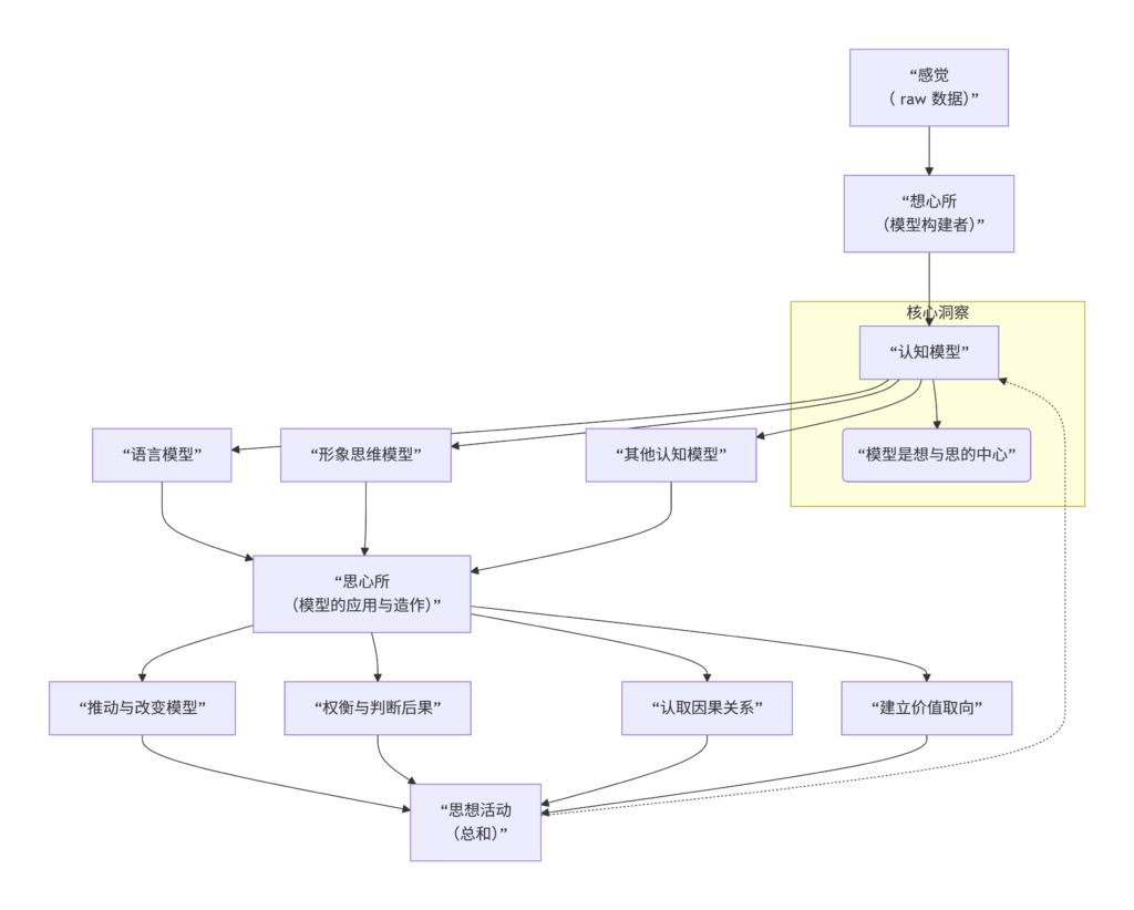 - 因此,“模型”是整个认知活动的绝对中心。它是“想”的产物,又是“思”的舞台和对象。