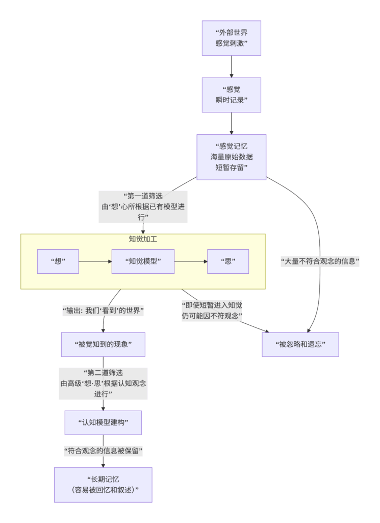 - 即使一个信息侥幸突破了第一关,进入了你的知觉,当高级的 “想·思” 心所将其与已有的认知模型(你的信念、知识体系)进行整合时,它仍然面临筛选。