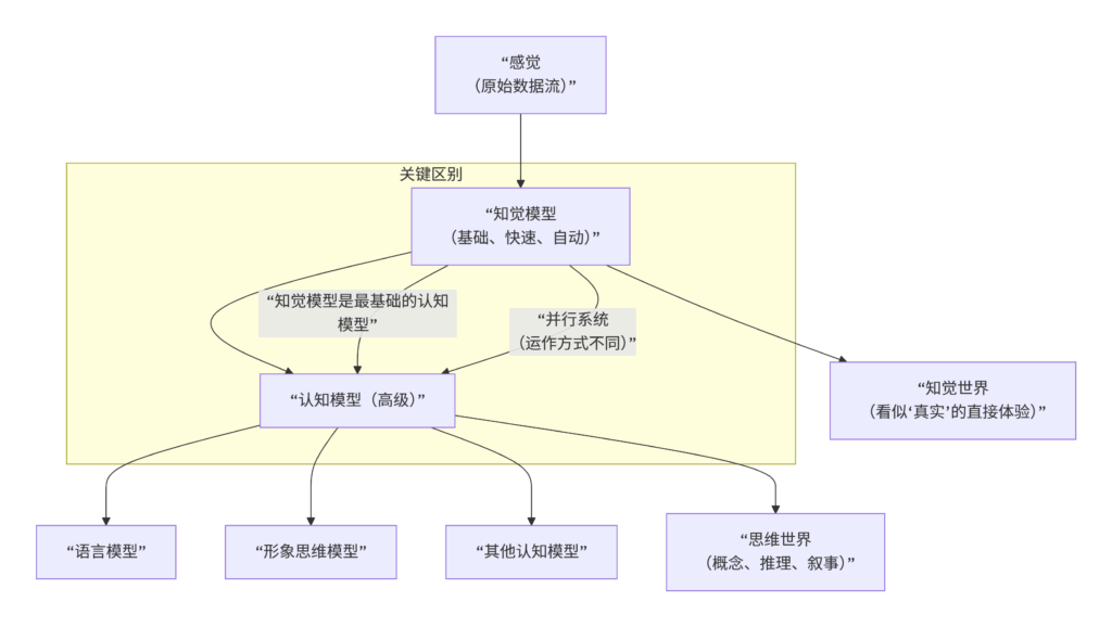 好的,这张图及其说明,是在前一张图的基础上,对认知过程做了一个更精微、更关键的区分。它指出了我们认知系统中存在一个基础且自动化的“知觉模型”,与其他更高级的“认知模型”并行运作。