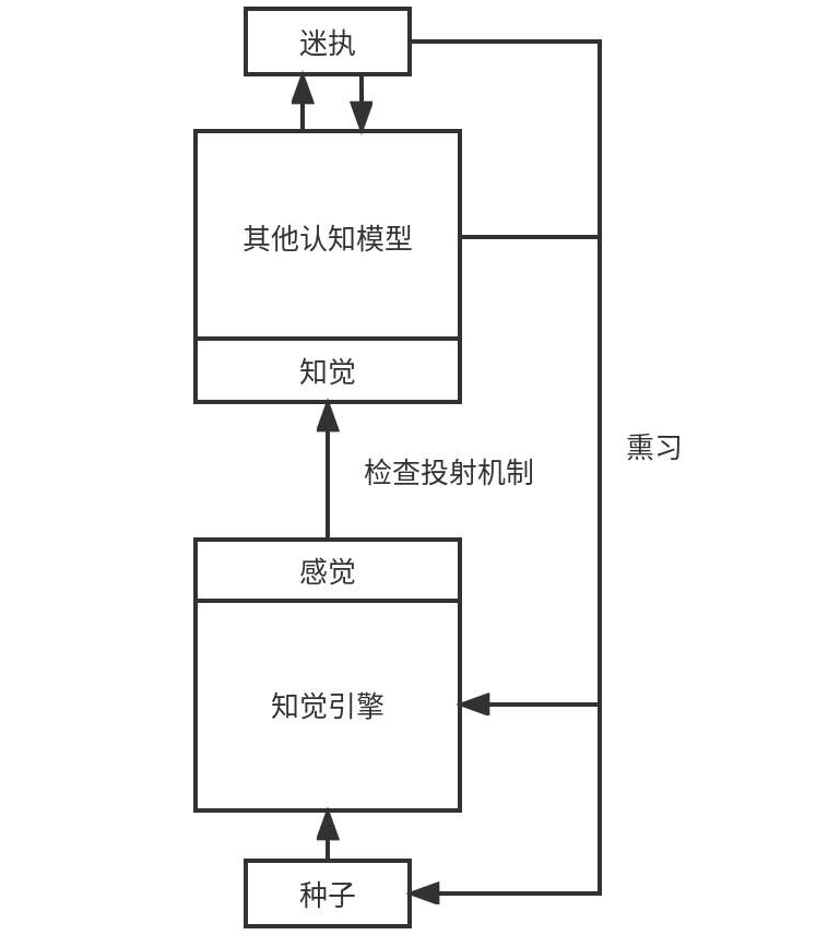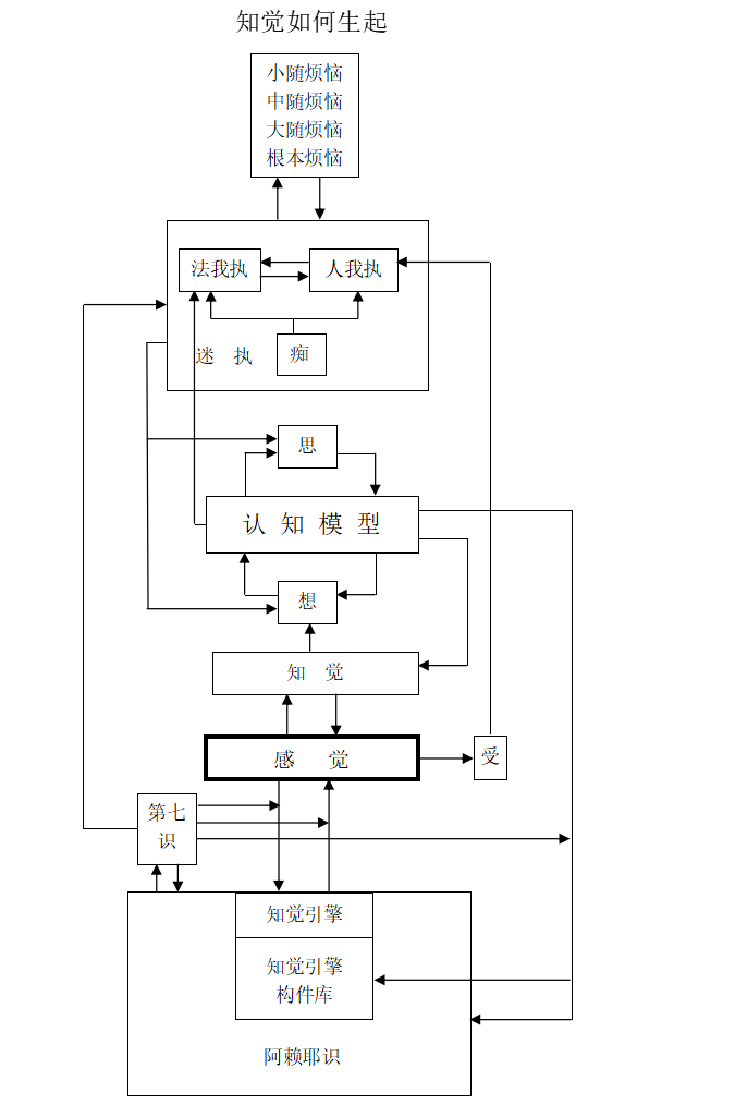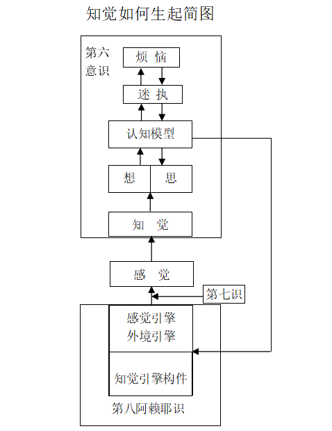 上图的核心是两步。第一步,由阿赖耶识想思综合种子信息生起知觉。第二步,意识想思建构认知模型。意识的迷执主要影响第二步,第七识主要影响第一步。这样可以化简成下图。