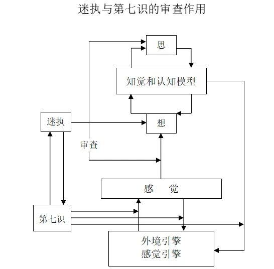 • 图表中贯穿的 “第七识” 是关键。它并非垂直流程中的一环,而是凌驾于整个系统之上的“恒审思量”机制