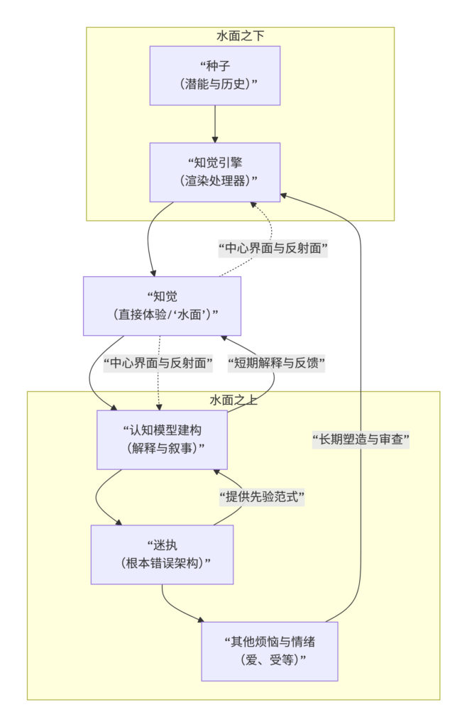 1. 单向生成,双向加固:箭头清晰地显示了从种子到烦恼的生成流向。但同时,存在隐性的反馈回路(图中未画,但由第七识的作用实现):上层的迷执和烦恼,通过第七识的审查机制,反过来塑造底层的引擎和种子,使其输出更符合上层预期。这构成了系统的自我强化循环。