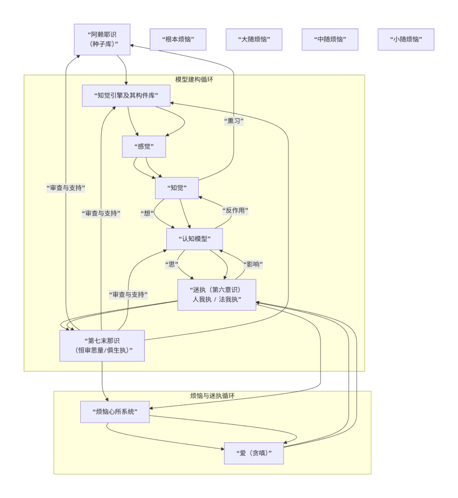 这张图简明地揭示了:我们的一切痛苦(烦恼),源于一套被深层审查官(第七识)严格控制的、自我验证的认知模拟系统。修行,就是突破第七识的审查,瓦解整个链条的自我循环,从源头上将系统升级。