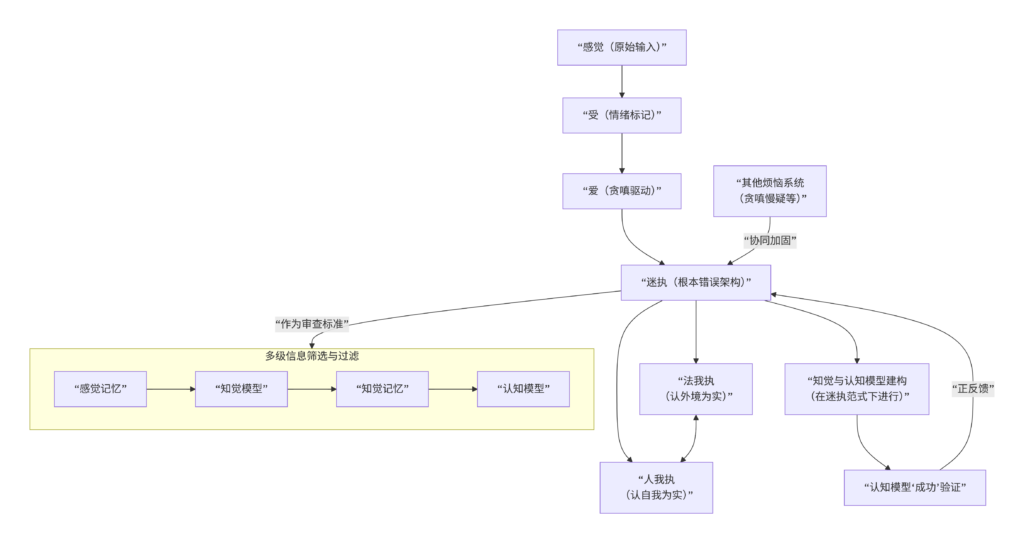 为了直观地展示这个以迷执为核心的“自我巩固认知系统”,我们可以通过下面的系统关系图来理解其内在结构: