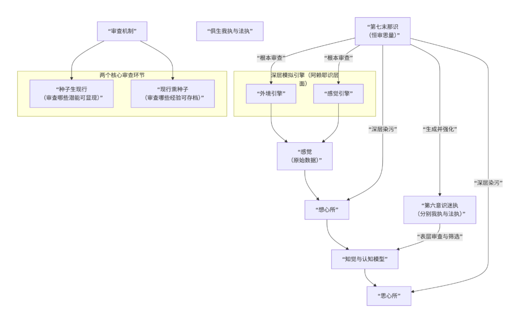 • 路径:第七识审查种子与知觉引擎(控制输入),也审查认知模型与迷执(控制解释)。