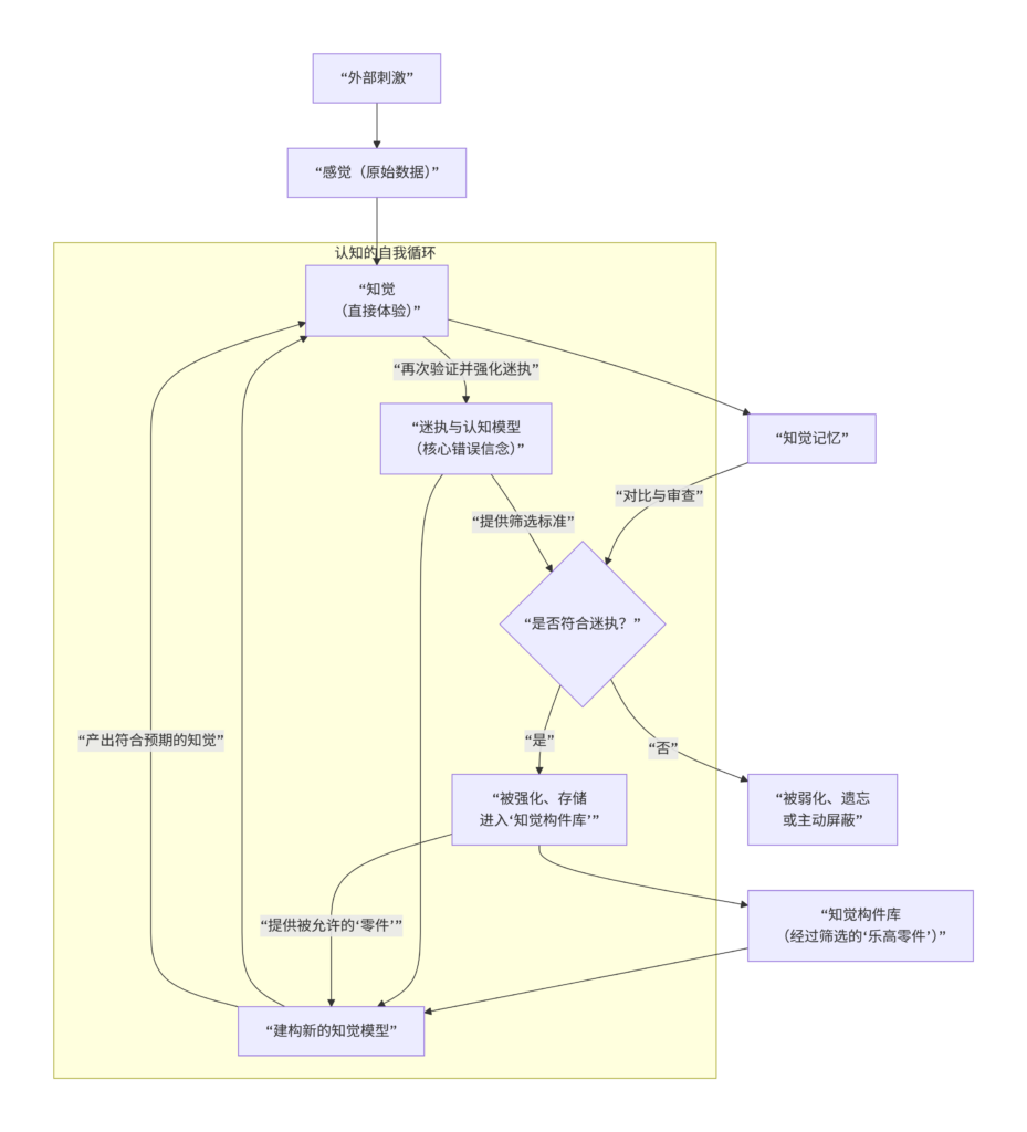 这个系统揭示了我们的世界观之所以如此坚固,并非因为它正确,而是因为一个由多种心理力量共同维护的、精密的 “自我证明”循环