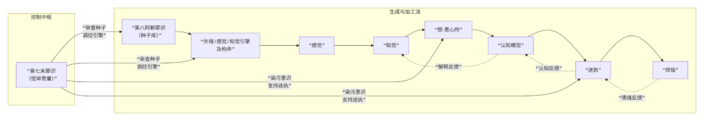 此图自下而上,描绘了认知从潜在种子到具体烦恼的完整生起路径,并由第七识横向贯通进行控制。