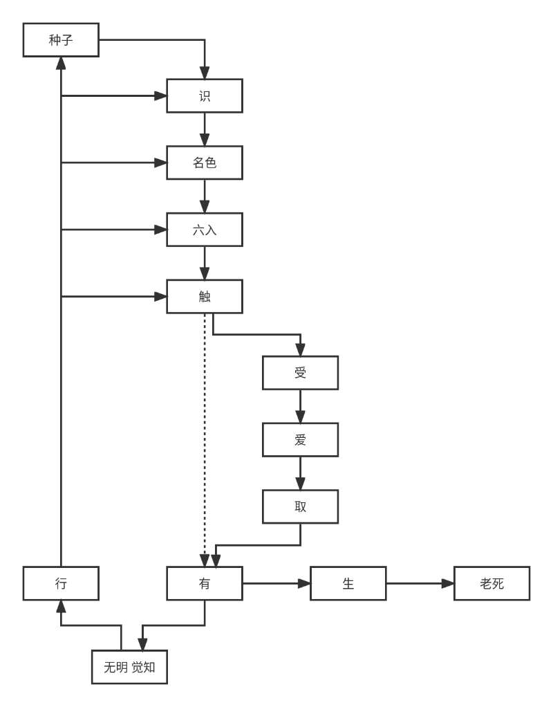 - 种子又通过“行”的微细循环推动后续缘起支的显现。